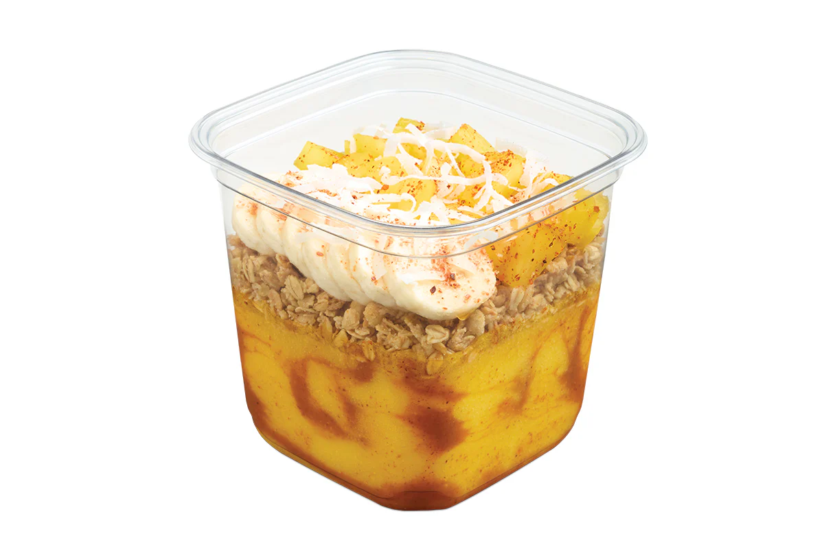 Quinoa • Brown Rice • Mango • Pineapple • Banana • Granola • Coconut • Oat Milk • Chia Seeds